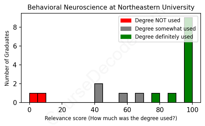 The verdict? Above average. Overall, with an average relevance score of 75%, Behavioral Neuroscience graduates from Northeastern University have a higher likelihood (+8%) of finding work in this field compared to the average graduate across all fields: