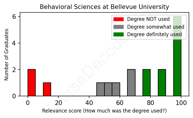 The verdict? Slightly above average. Overall, with an average relevance score of 68%, Behavioral Sciences graduates from Bellevue University have a slightly higher likelihood (+1%) of finding work in this field compared to the average graduate across all fields:
