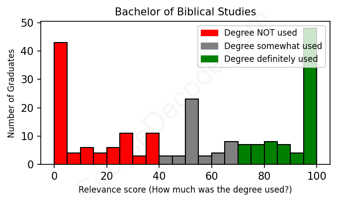 The verdict? Significantly below average. Overall, with an average relevance score of 51%, Biblical Studies graduates have a much lower likelihood (-16%) of finding work in this field compared to the average graduate across all fields: