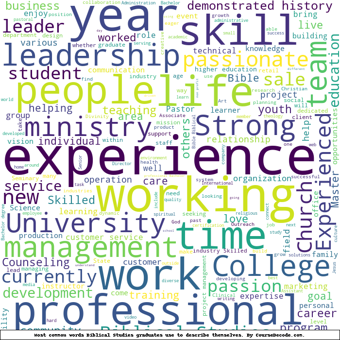 Here is a visual representation of the most common words seen in the "about" section of LinkedIn profiles who have a Bachelor degree in Biblical Studies. This may or may not be useful: