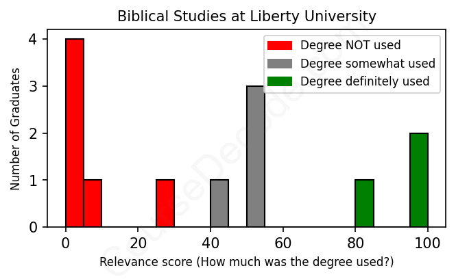 The verdict? Bad. Overall, with an average relevance score of 39%, Biblical Studies graduates from Liberty University have a substantially lower likelihood (-28%) of finding work in this field compared to the average graduate across all fields: