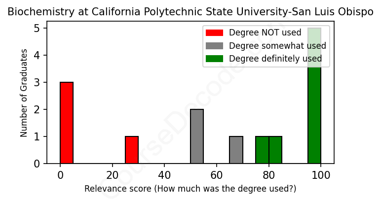 The verdict? Below average. Overall, with an average relevance score of 60%, Biochemistry graduates from California Polytechnic State University-San Luis Obispo have a lower likelihood (-7%) of finding work in this field compared to the average graduate across all fields: