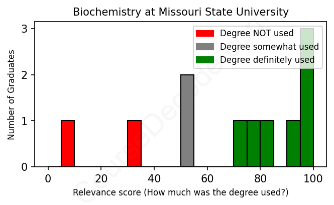 The verdict? Slightly above average. Overall, with an average relevance score of 68%, Biochemistry graduates from Missouri State University have a slightly higher likelihood (+1%) of finding work in this field compared to the average graduate across all fields: