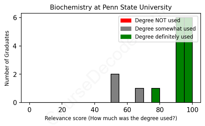 The verdict? Significantly above average. Overall, with an average relevance score of 86%, Biochemistry graduates from Penn State University have a much higher likelihood (+19%) of finding work in this field compared to the average graduate across all fields: