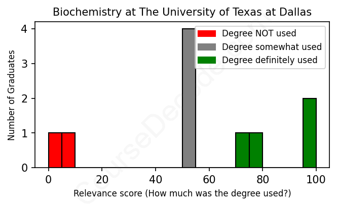 The verdict? Significantly below average. Overall, with an average relevance score of 56%, Biochemistry graduates from The University of Texas at Dallas have a much lower likelihood (-11%) of finding work in this field compared to the average graduate across all fields: