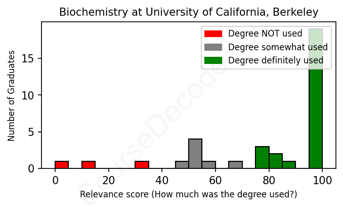 The verdict? Significantly above average. Overall, with an average relevance score of 80%, Biochemistry graduates from University of California, Berkeley have a much higher likelihood (+13%) of finding work in this field compared to the average graduate across all fields: