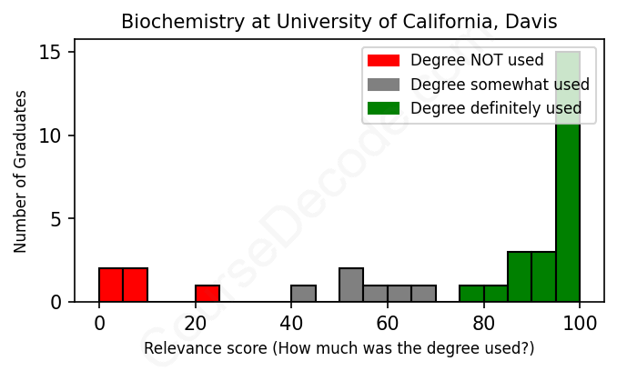 The verdict? Above average. Overall, with an average relevance score of 75%, Biochemistry graduates from University of California, Davis have a higher likelihood (+8%) of finding work in this field compared to the average graduate across all fields: