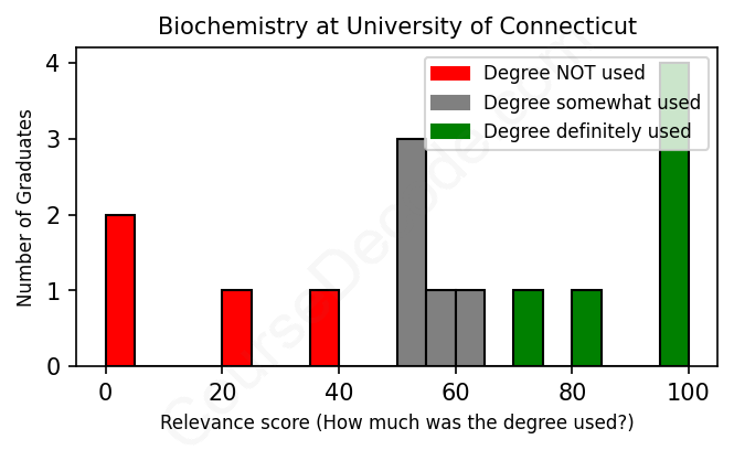 The verdict? Below average. Overall, with an average relevance score of 59%, Biochemistry graduates from University of Connecticut have a lower likelihood (-8%) of finding work in this field compared to the average graduate across all fields: