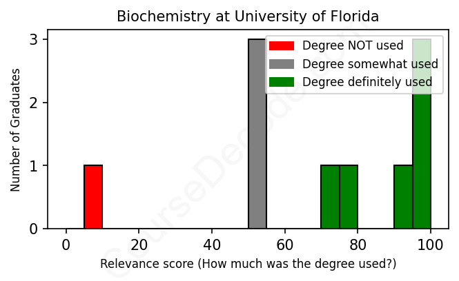 The verdict? Slightly above average. Overall, with an average relevance score of 69%, Biochemistry graduates from University of Florida have a slightly higher likelihood (+2%) of finding work in this field compared to the average graduate across all fields:
