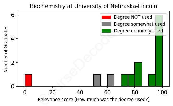The verdict? Significantly above average. Overall, with an average relevance score of 79%, Biochemistry graduates from University of Nebraska-Lincoln have a much higher likelihood (+12%) of finding work in this field compared to the average graduate across all fields: