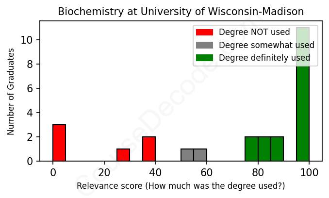 First, some facts. Of the Biochemistry graduates from University of Wisconsin-Madison we've analyzed , here's how many have used (or NOT used) their degree in their career: