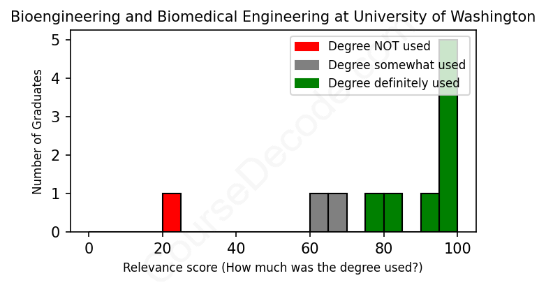 The verdict? Significantly above average. Overall, with an average relevance score of 82%, Bioengineering and Biomedical Engineering graduates from University of Washington have a much higher likelihood (+15%) of finding work in this field compared to the average graduate across all fields:
