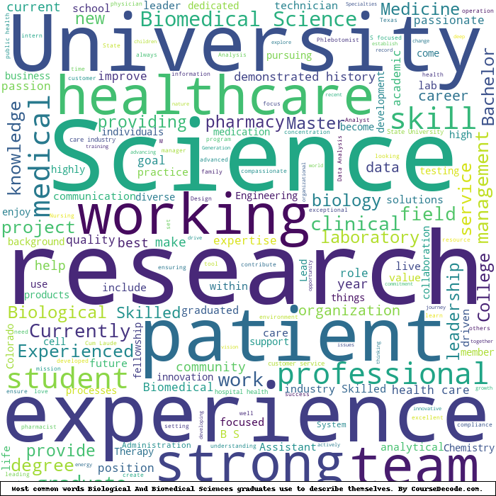 Here is a visual representation of the most common words seen in the "about" section of LinkedIn profiles who have a Bachelor degree in Biological And Biomedical Sciences. This may or may not be useful: