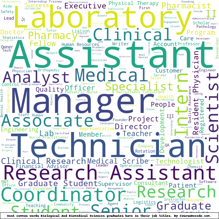 Here is a visual representation of the most common words in job titles for Biological And Biomedical Sciences graduates: