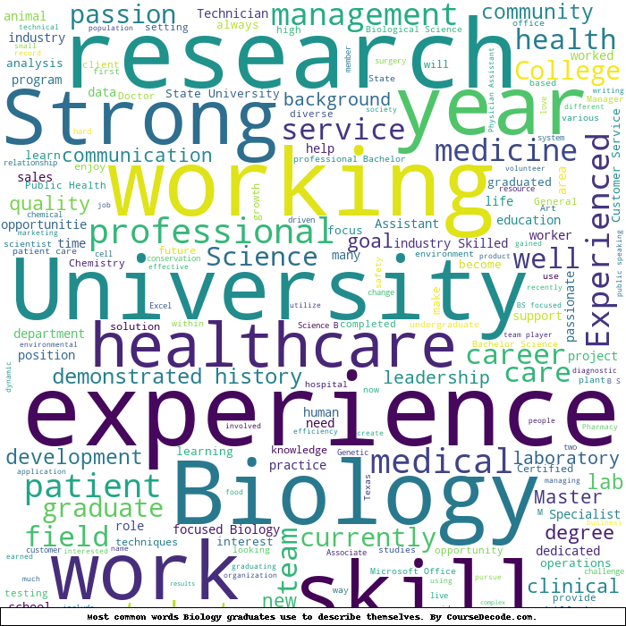 Here is a visual representation of the most common words seen in the "about" section of LinkedIn profiles who have a Bachelor degree in Biology. This may or may not be useful: