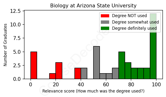 The verdict? Slightly below average. Overall, with an average relevance score of 63%, Biology graduates from Arizona State University have a slightly lower likelihood (-4%) of finding work in this field compared to the average graduate across all fields: