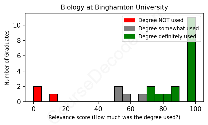The verdict? Above average. Overall, with an average relevance score of 75%, Biology graduates from Binghamton University have a higher likelihood (+8%) of finding work in this field compared to the average graduate across all fields: