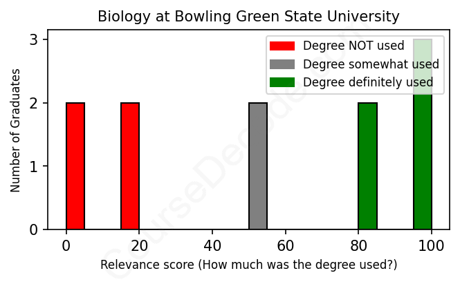The verdict? Significantly below average. Overall, with an average relevance score of 54%, Biology graduates from Bowling Green State University have a much lower likelihood (-13%) of finding work in this field compared to the average graduate across all fields: