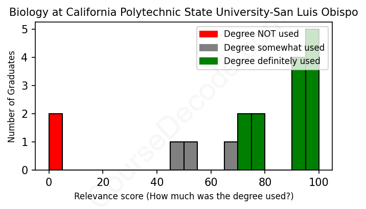 The verdict? Above average. Overall, with an average relevance score of 73%, Biology graduates from California Polytechnic State University-San Luis Obispo have a higher likelihood (+6%) of finding work in this field compared to the average graduate across all fields: