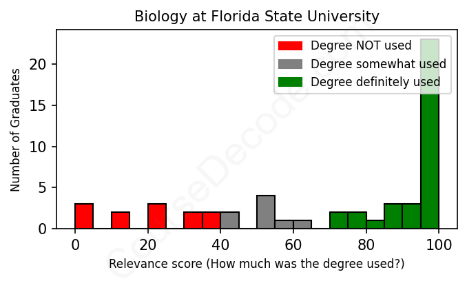 The verdict? Slightly above average. Overall, with an average relevance score of 71%, Biology graduates from Florida State University have a slightly higher likelihood (+4%) of finding work in this field compared to the average graduate across all fields: