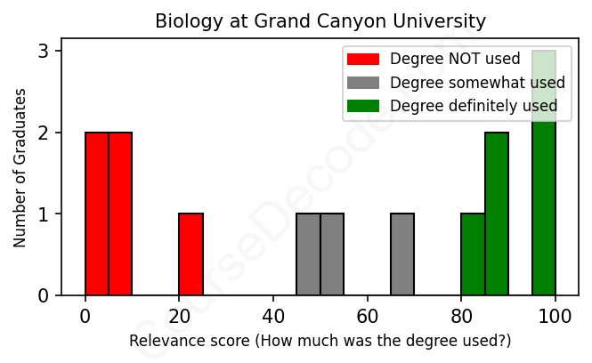 The verdict? Significantly below average. Overall, with an average relevance score of 54%, Biology graduates from Grand Canyon University have a much lower likelihood (-13%) of finding work in this field compared to the average graduate across all fields: