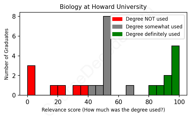 The verdict? Significantly below average. Overall, with an average relevance score of 56%, Biology graduates from Howard University have a much lower likelihood (-11%) of finding work in this field compared to the average graduate across all fields: