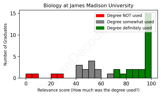 The verdict? Slightly above average. Overall, with an average relevance score of 71%, Biology graduates from James Madison University have a slightly higher likelihood (+4%) of finding work in this field compared to the average graduate across all fields: