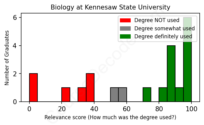 The verdict? On par with the average. Overall, with an average relevance score of 67%, Biology graduates from Kennesaw State University have about the same likelihood of finding work in this field as the average graduate across all fields: