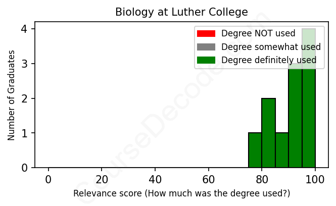 The verdict? Great! Overall, with an average relevance score of 90%, Biology graduates from Luther College have a substantially higher likelihood (+23%) of finding work in this field compared to the average graduate across all fields: