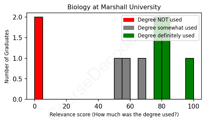 The verdict? Below average. Overall, with an average relevance score of 59%, Biology graduates from Marshall University have a lower likelihood (-8%) of finding work in this field compared to the average graduate across all fields:
