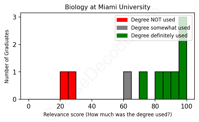 The verdict? Above average. Overall, with an average relevance score of 74%, Biology graduates from Miami University have a higher likelihood (+7%) of finding work in this field compared to the average graduate across all fields: