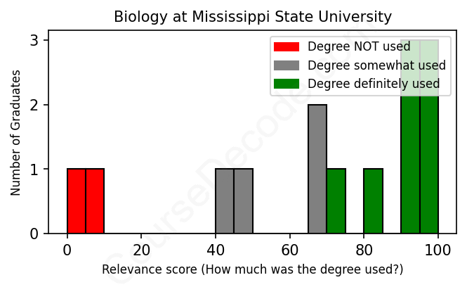 The verdict? Slightly above average. Overall, with an average relevance score of 68%, Biology graduates from Mississippi State University have a slightly higher likelihood (+1%) of finding work in this field compared to the average graduate across all fields: