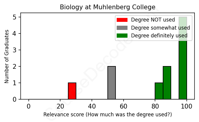 The verdict? Significantly above average. Overall, with an average relevance score of 80%, Biology graduates from Muhlenberg College have a much higher likelihood (+13%) of finding work in this field compared to the average graduate across all fields: