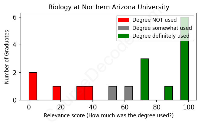 The verdict? Slightly below average. Overall, with an average relevance score of 64%, Biology graduates from Northern Arizona University have a slightly lower likelihood (-3%) of finding work in this field compared to the average graduate across all fields: