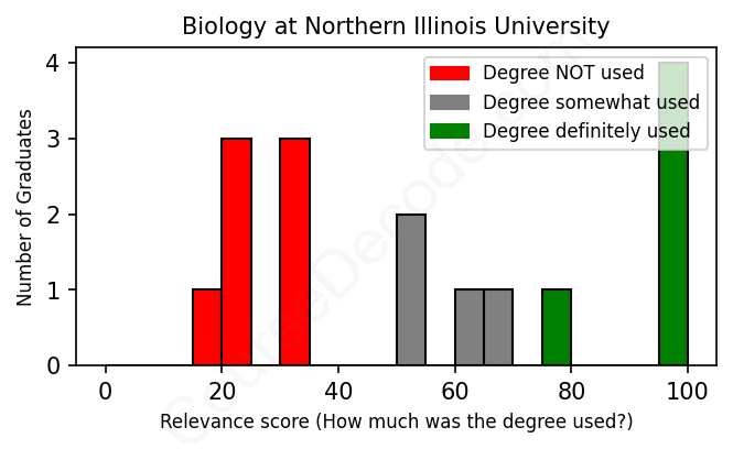 The verdict? Significantly below average. Overall, with an average relevance score of 55%, Biology graduates from Northern Illinois University have a much lower likelihood (-12%) of finding work in this field compared to the average graduate across all fields: