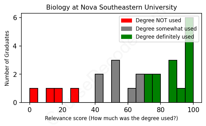 The verdict? Slightly below average. Overall, with an average relevance score of 66%, Biology graduates from Nova Southeastern University have a slightly lower likelihood (-1%) of finding work in this field compared to the average graduate across all fields: