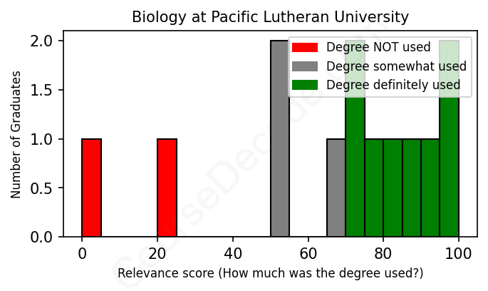 The verdict? On par with the average. Overall, with an average relevance score of 67%, Biology graduates from Pacific Lutheran University have about the same likelihood of finding work in this field as the average graduate across all fields: