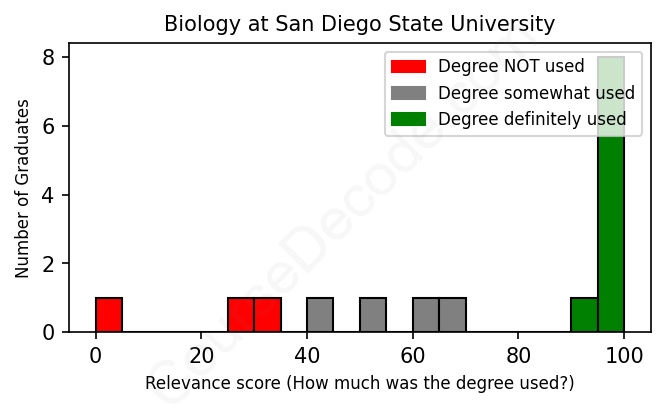 The verdict? Slightly above average. Overall, with an average relevance score of 72%, Biology graduates from San Diego State University have a slightly higher likelihood (+5%) of finding work in this field compared to the average graduate across all fields: