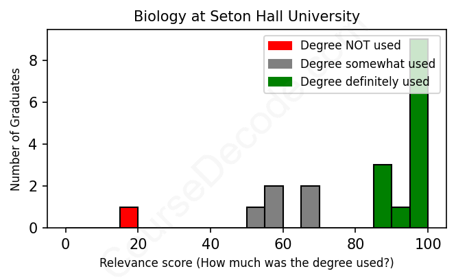 The verdict? Significantly above average. Overall, with an average relevance score of 82%, Biology graduates from Seton Hall University have a much higher likelihood (+15%) of finding work in this field compared to the average graduate across all fields: