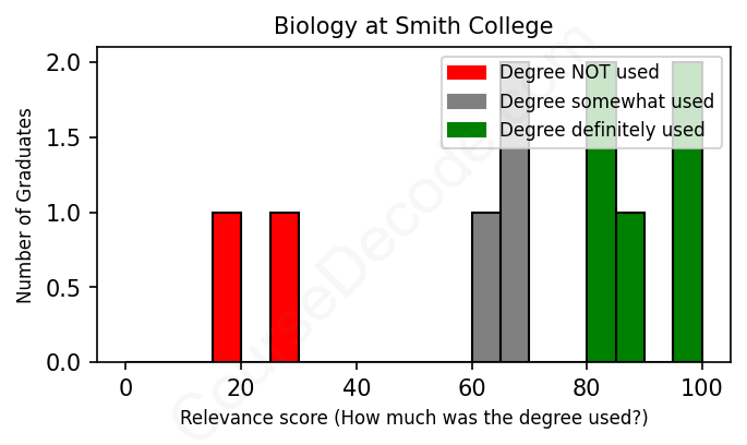 The verdict? Slightly above average. Overall, with an average relevance score of 68%, Biology graduates from Smith College have a slightly higher likelihood (+1%) of finding work in this field compared to the average graduate across all fields: