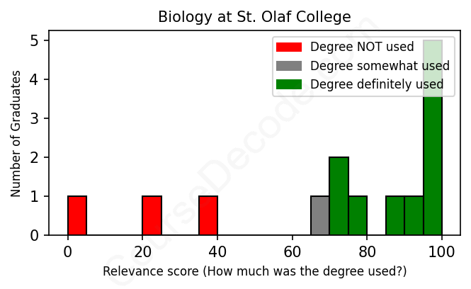 The verdict? Above average. Overall, with an average relevance score of 74%, Biology graduates from St. Olaf College have a higher likelihood (+7%) of finding work in this field compared to the average graduate across all fields: