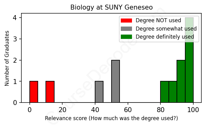 The verdict? Slightly above average. Overall, with an average relevance score of 69%, Biology graduates from SUNY Geneseo have a slightly higher likelihood (+2%) of finding work in this field compared to the average graduate across all fields: