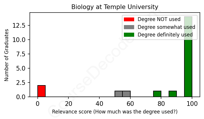 The verdict? Significantly above average. Overall, with an average relevance score of 83%, Biology graduates from Temple University have a much higher likelihood (+16%) of finding work in this field compared to the average graduate across all fields: