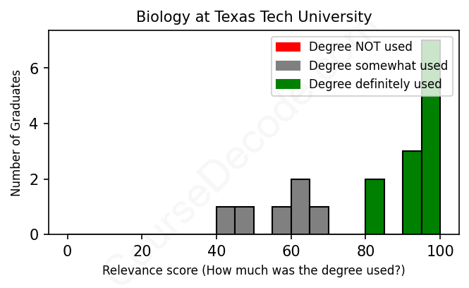 The verdict? Significantly above average. Overall, with an average relevance score of 81%, Biology graduates from Texas Tech University have a much higher likelihood (+14%) of finding work in this field compared to the average graduate across all fields: