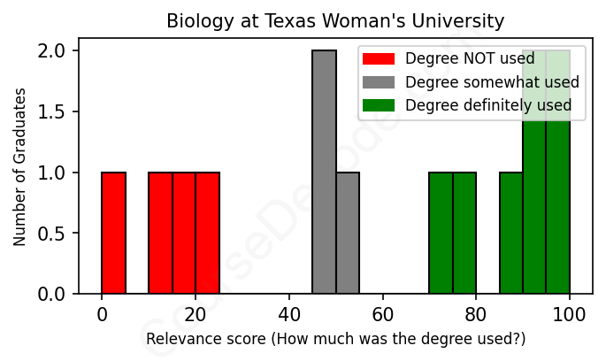The verdict? Below average. Overall, with an average relevance score of 58%, Biology graduates from Texas Woman's University have a lower likelihood (-9%) of finding work in this field compared to the average graduate across all fields: