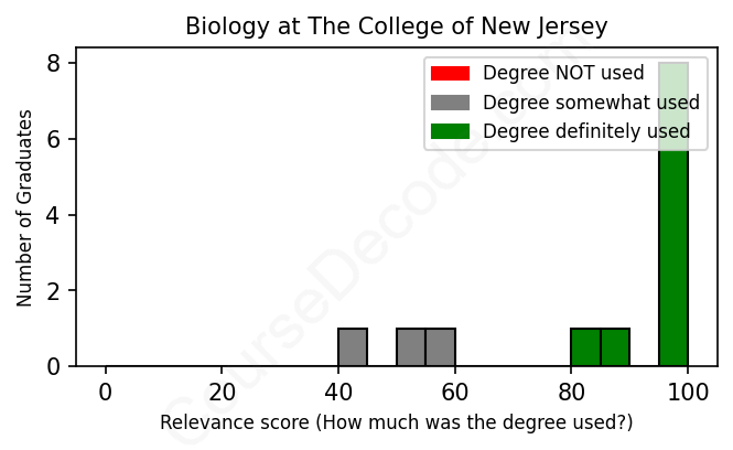 The verdict? Significantly above average. Overall, with an average relevance score of 86%, Biology graduates from The College of New Jersey have a much higher likelihood (+19%) of finding work in this field compared to the average graduate across all fields: