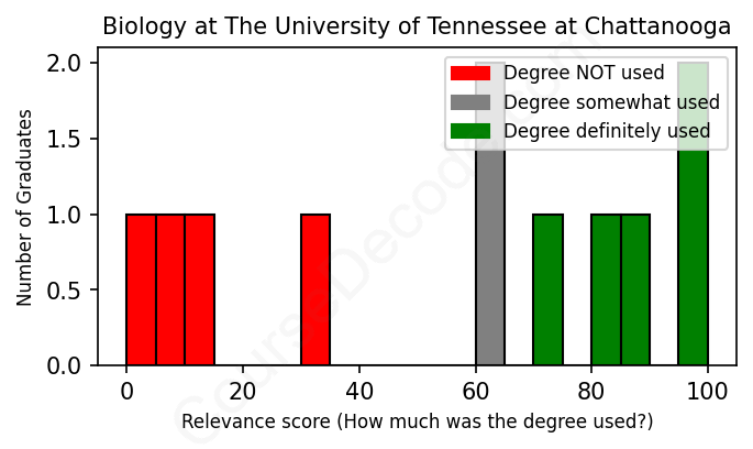 The verdict? Significantly below average. Overall, with an average relevance score of 56%, Biology graduates from The University of Tennessee at Chattanooga have a much lower likelihood (-11%) of finding work in this field compared to the average graduate across all fields: