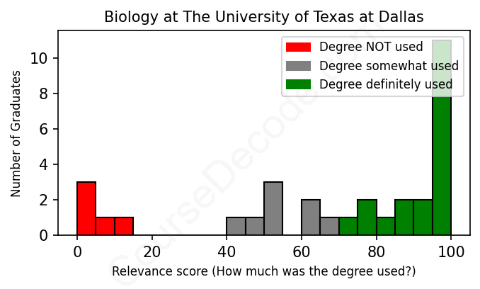 The verdict? Slightly above average. Overall, with an average relevance score of 69%, Biology graduates from The University of Texas at Dallas have a slightly higher likelihood (+2%) of finding work in this field compared to the average graduate across all fields: