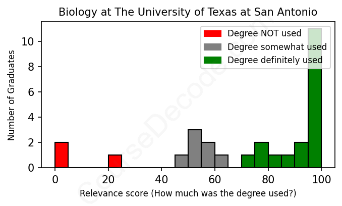 The verdict? Above average. Overall, with an average relevance score of 73%, Biology graduates from The University of Texas at San Antonio have a higher likelihood (+6%) of finding work in this field compared to the average graduate across all fields: