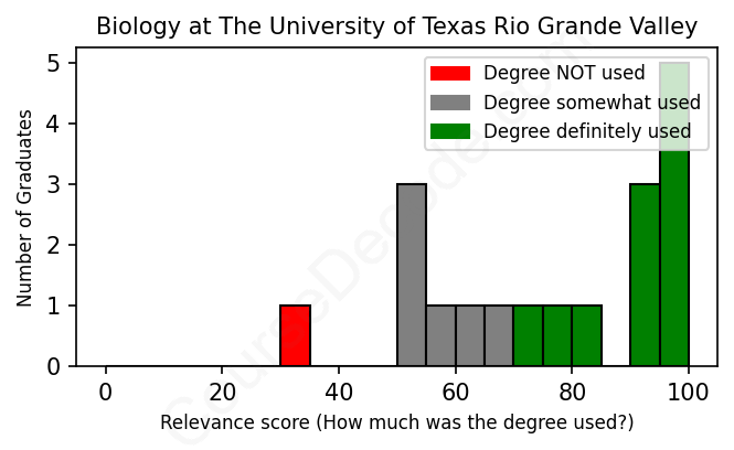 The verdict? Above average. Overall, with an average relevance score of 76%, Biology graduates from The University of Texas Rio Grande Valley have a higher likelihood (+9%) of finding work in this field compared to the average graduate across all fields: